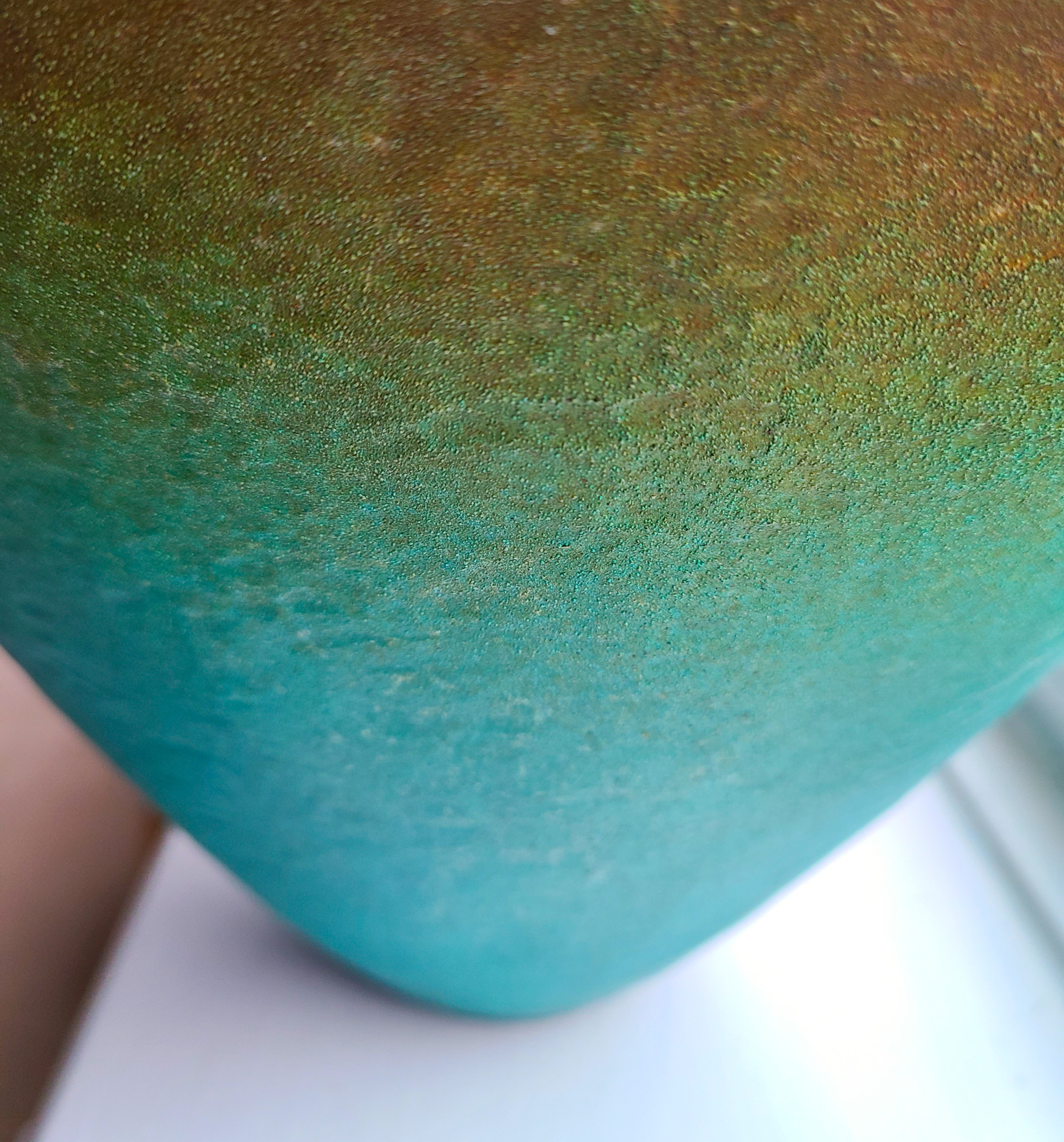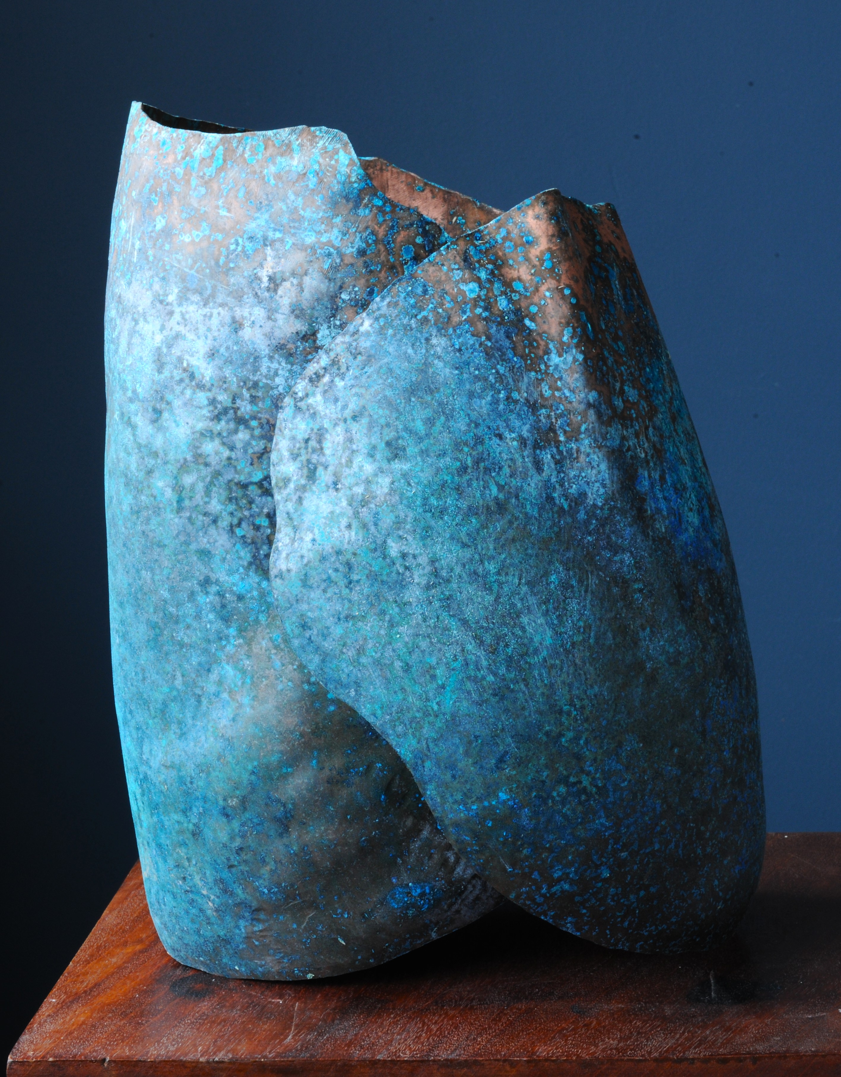A larger vessel with a buried patina of mid and pale blues and blue greens allowing the copper to show through in many places.