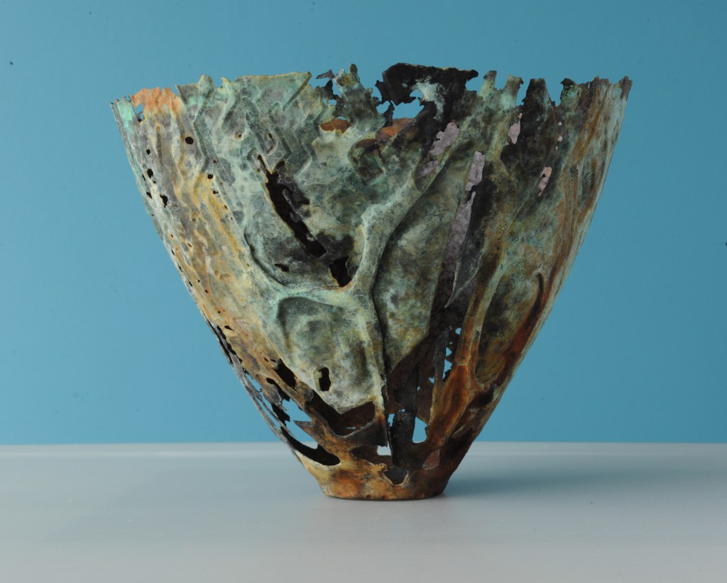 SH24/4 “Scour” The first experimental vessel I have created, after raising the copper was masked then etched out leaving the partially perforated vessel. The original idea came from seeing two world war two wrecks laying off the coast just south of Clevedon. The sea has all but dissolved the steel structure leaving a skeleton.