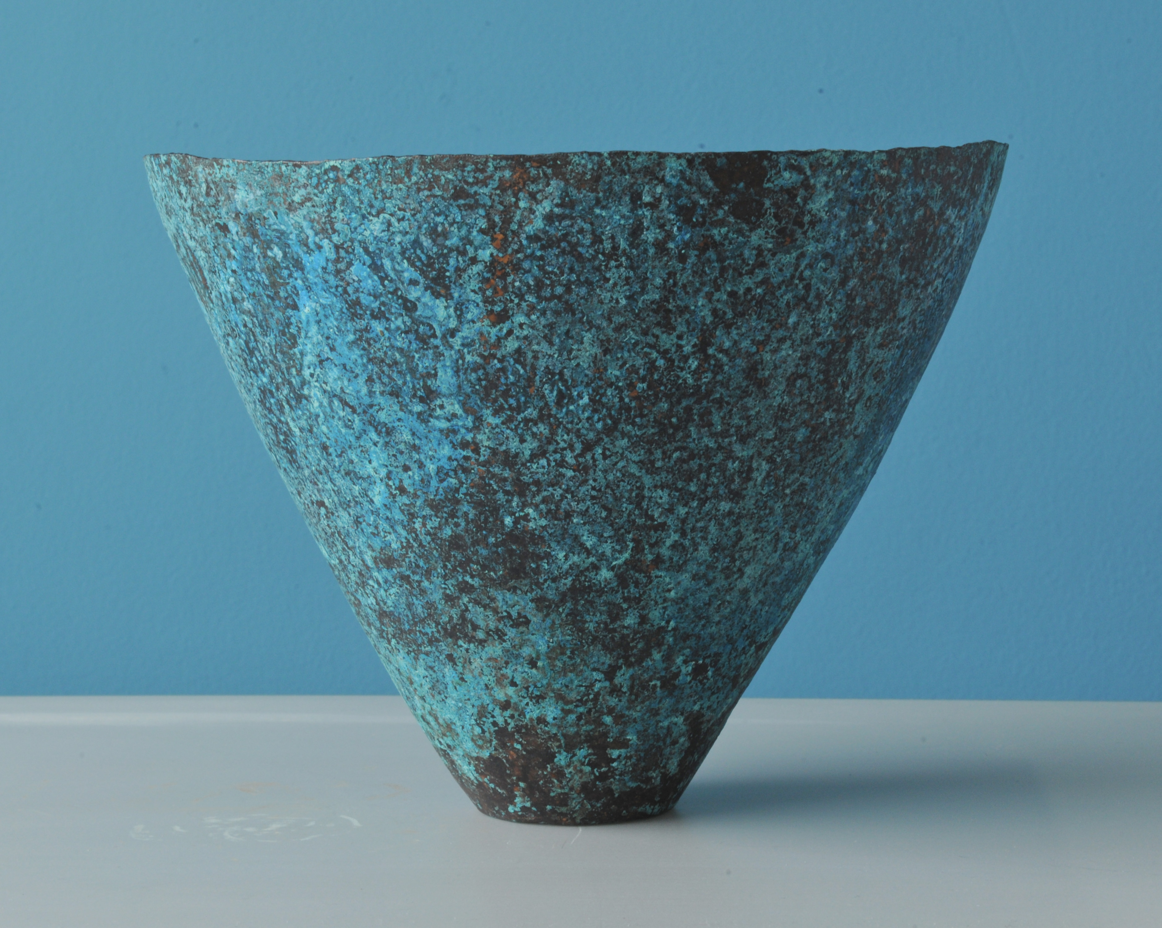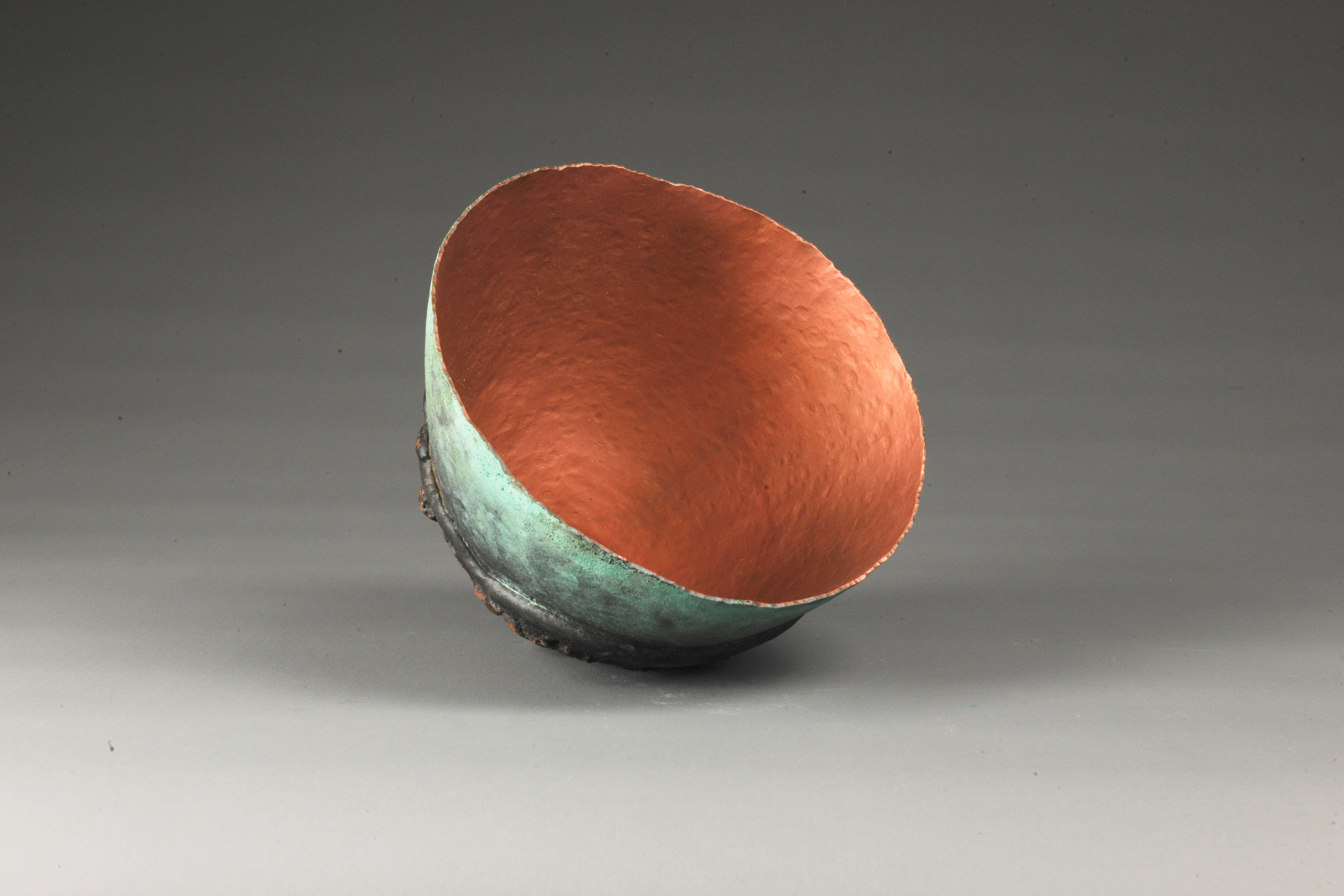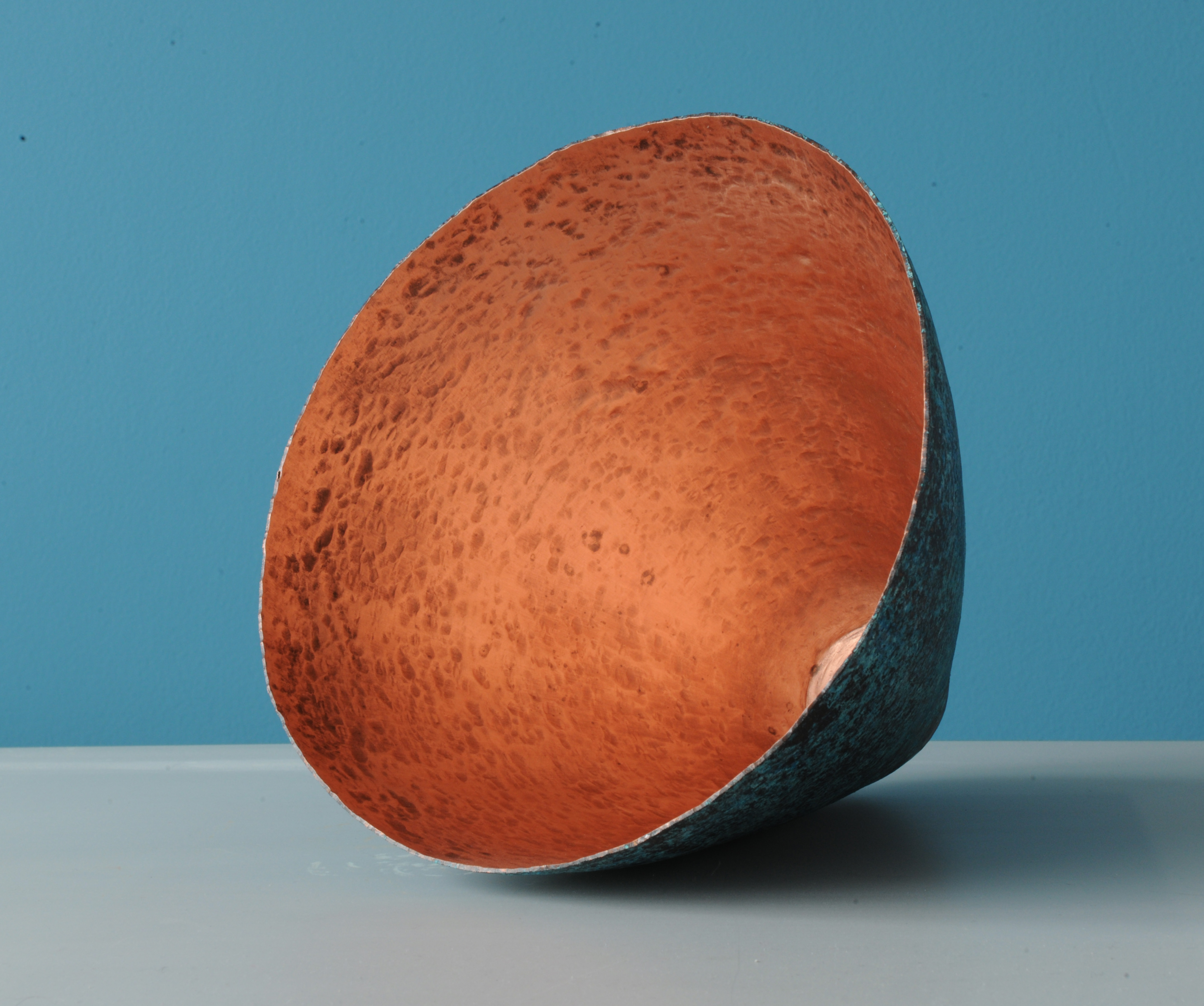 Hand raised copper with a buried patina creating a myriad of patination colours through to a wonderful copper base with rusty reds oranges contrasted with yellow greens. I have been trying to achieve a patination effect like this for some time, and here it is.