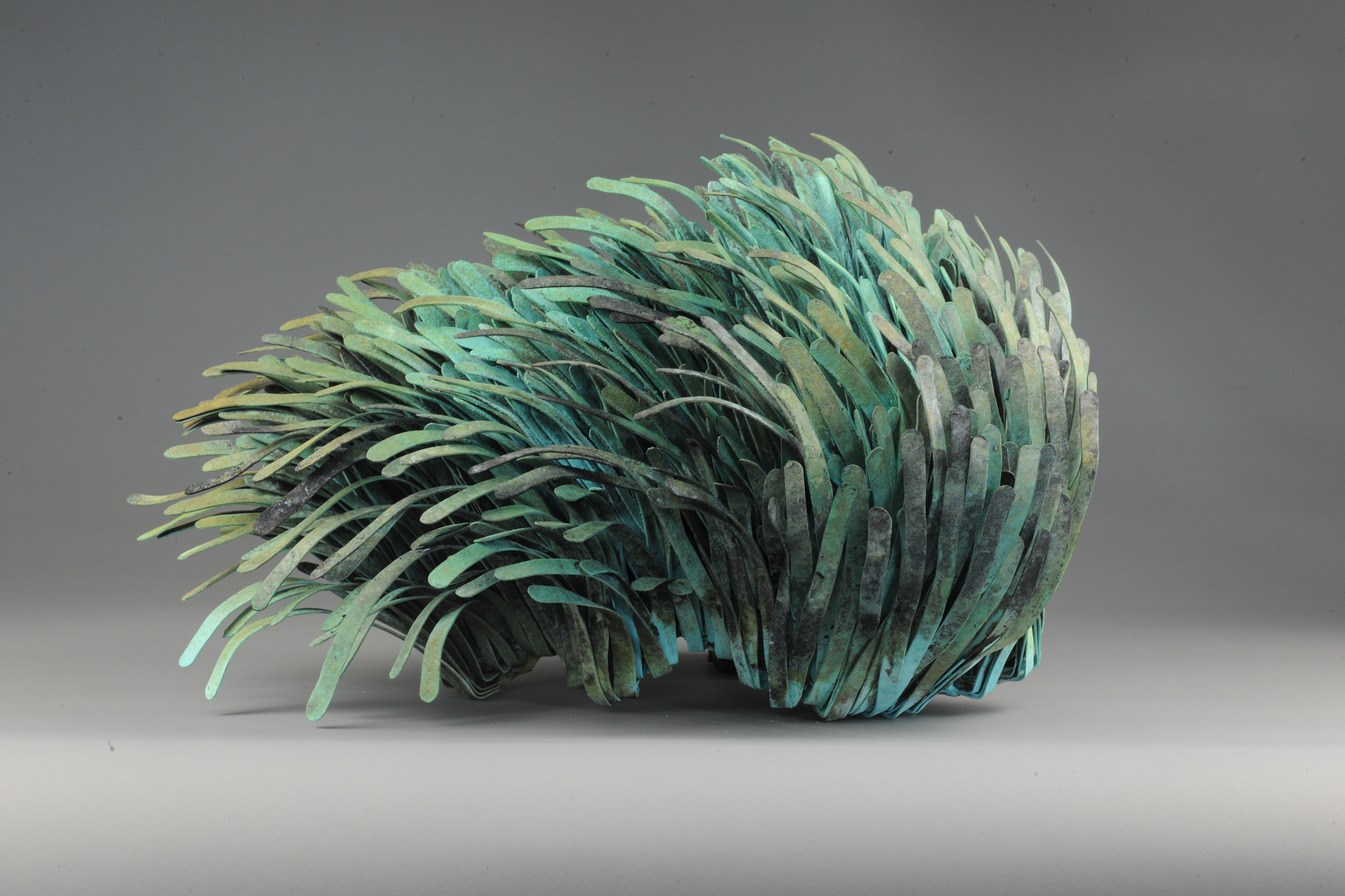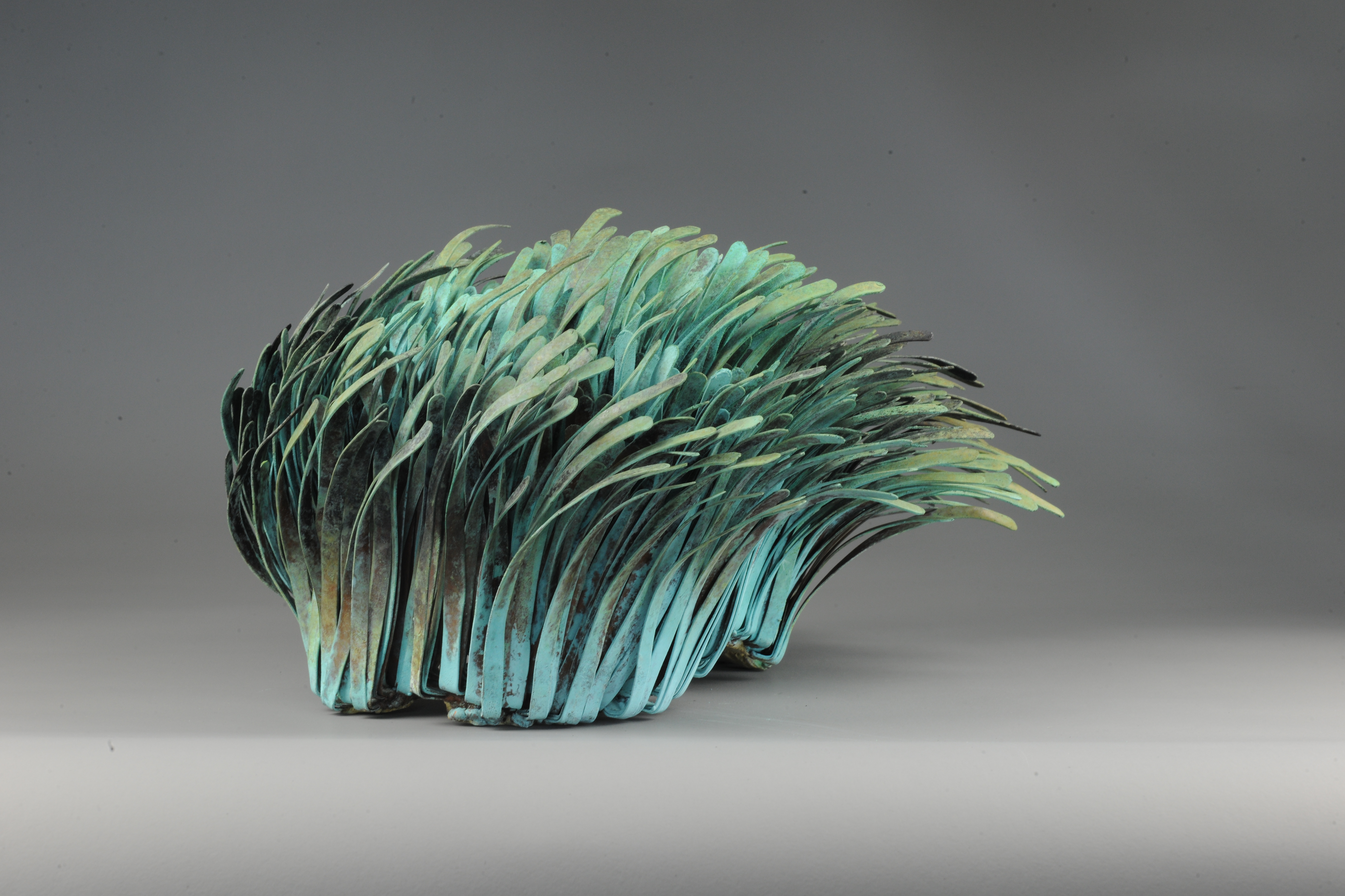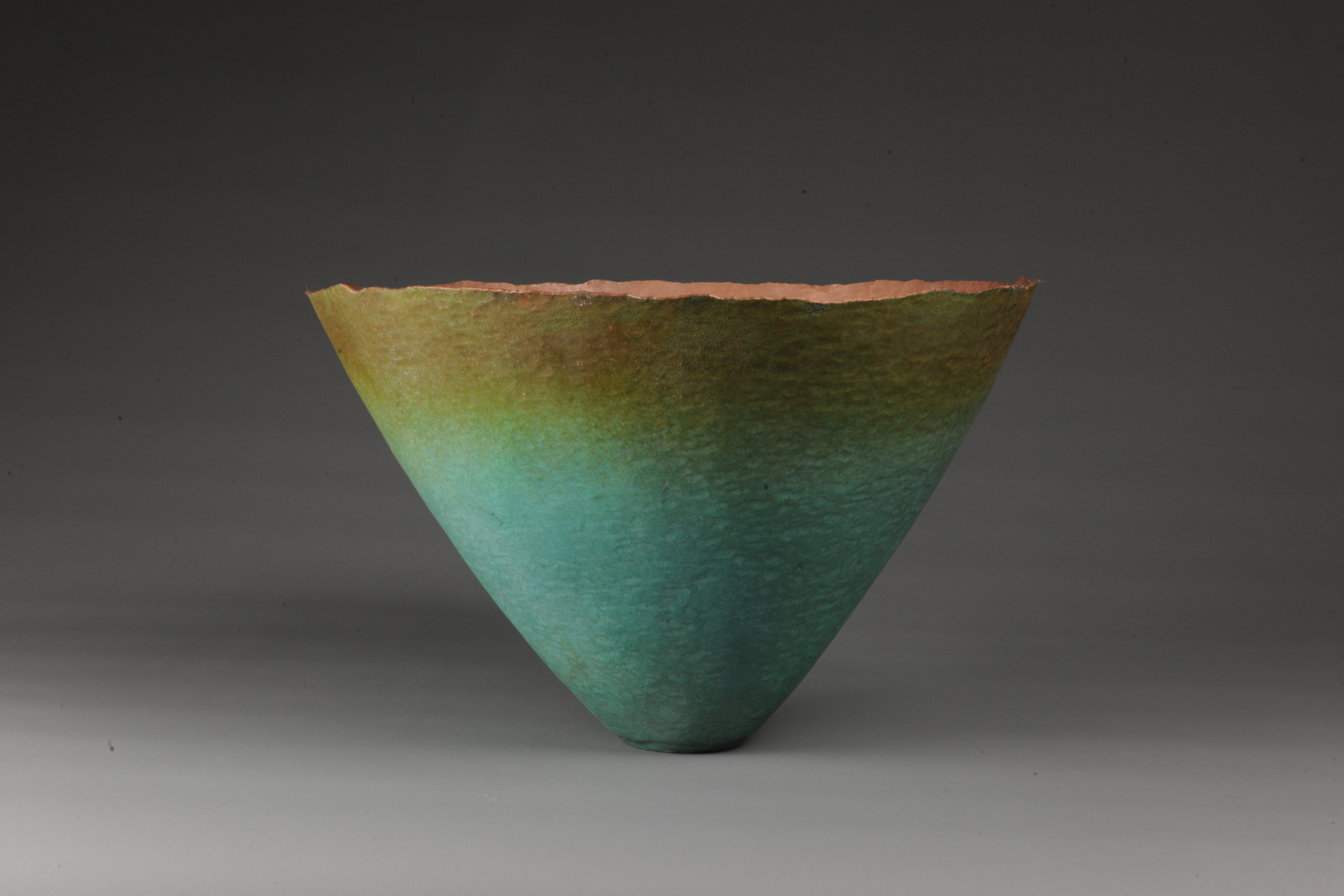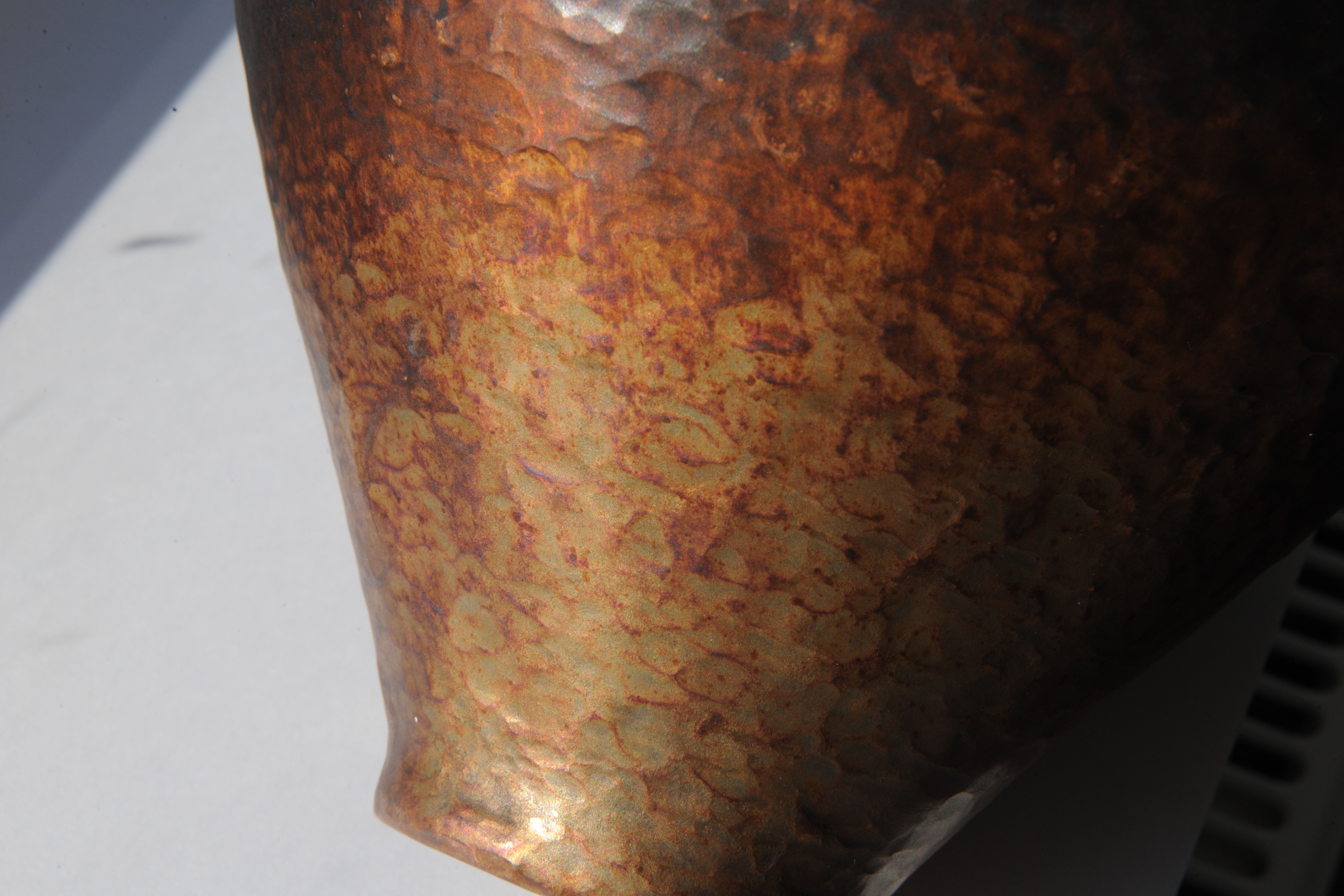 Hand raised copper with a buried patina creating a myriad of patination colours through to a wonderful copper base with rusty reds oranges contrasted with yellow greens. I have been trying to achieve a patination effect like this for some time, and here it is.