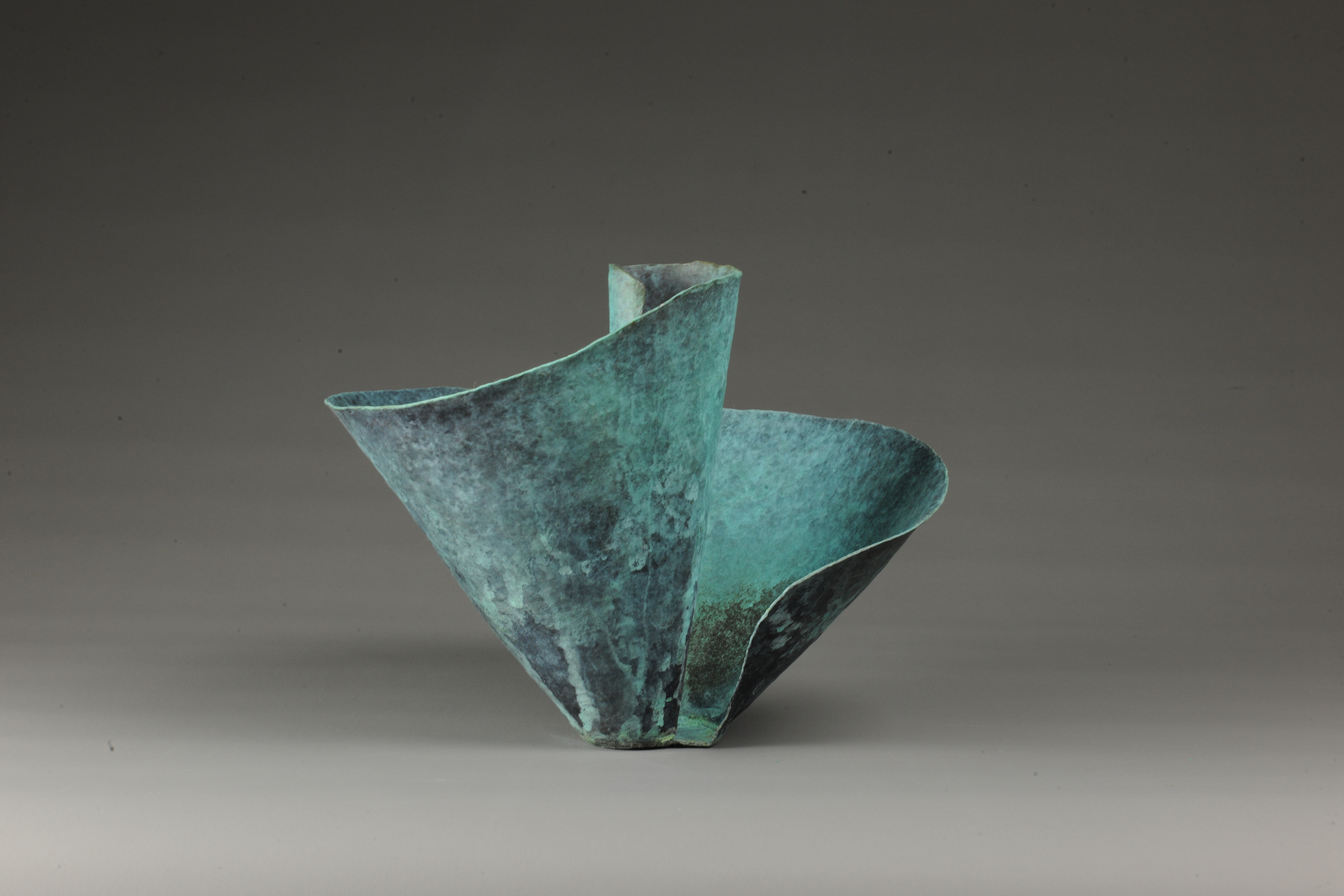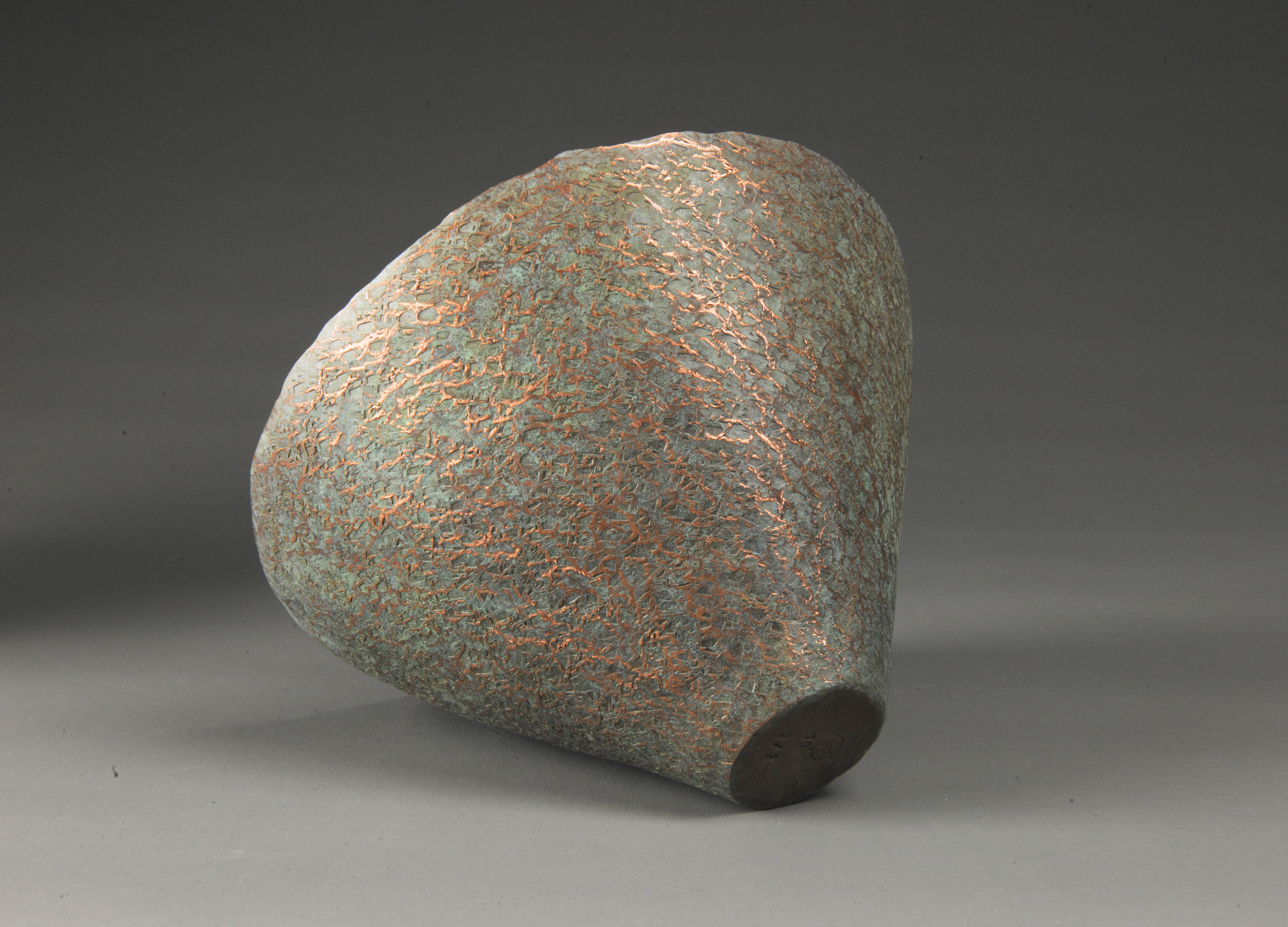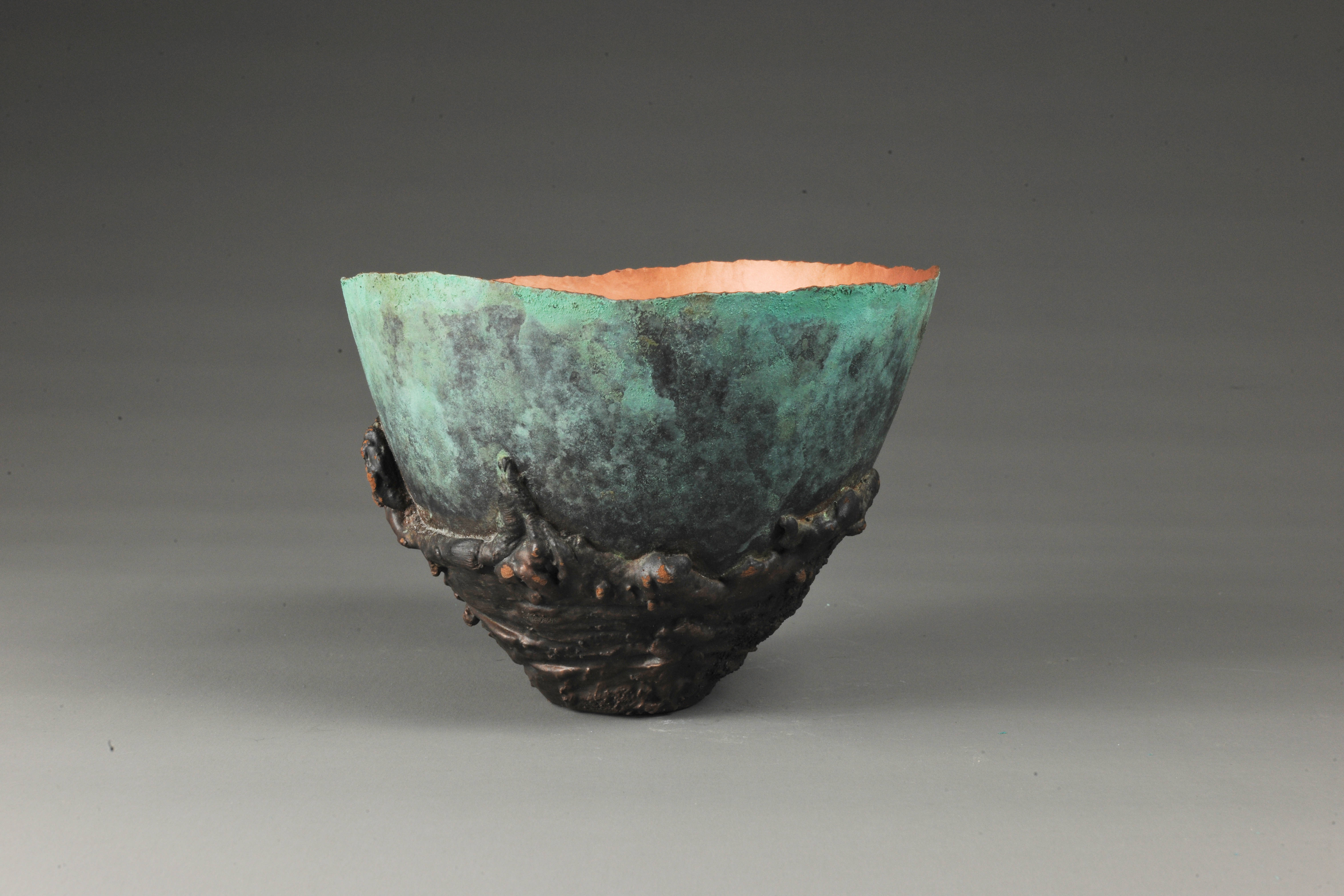 A fine patina allowing a lot of copper colouring through from the base upward, this darkens toward the rim of the vessel to represent the dark brooding sky.
