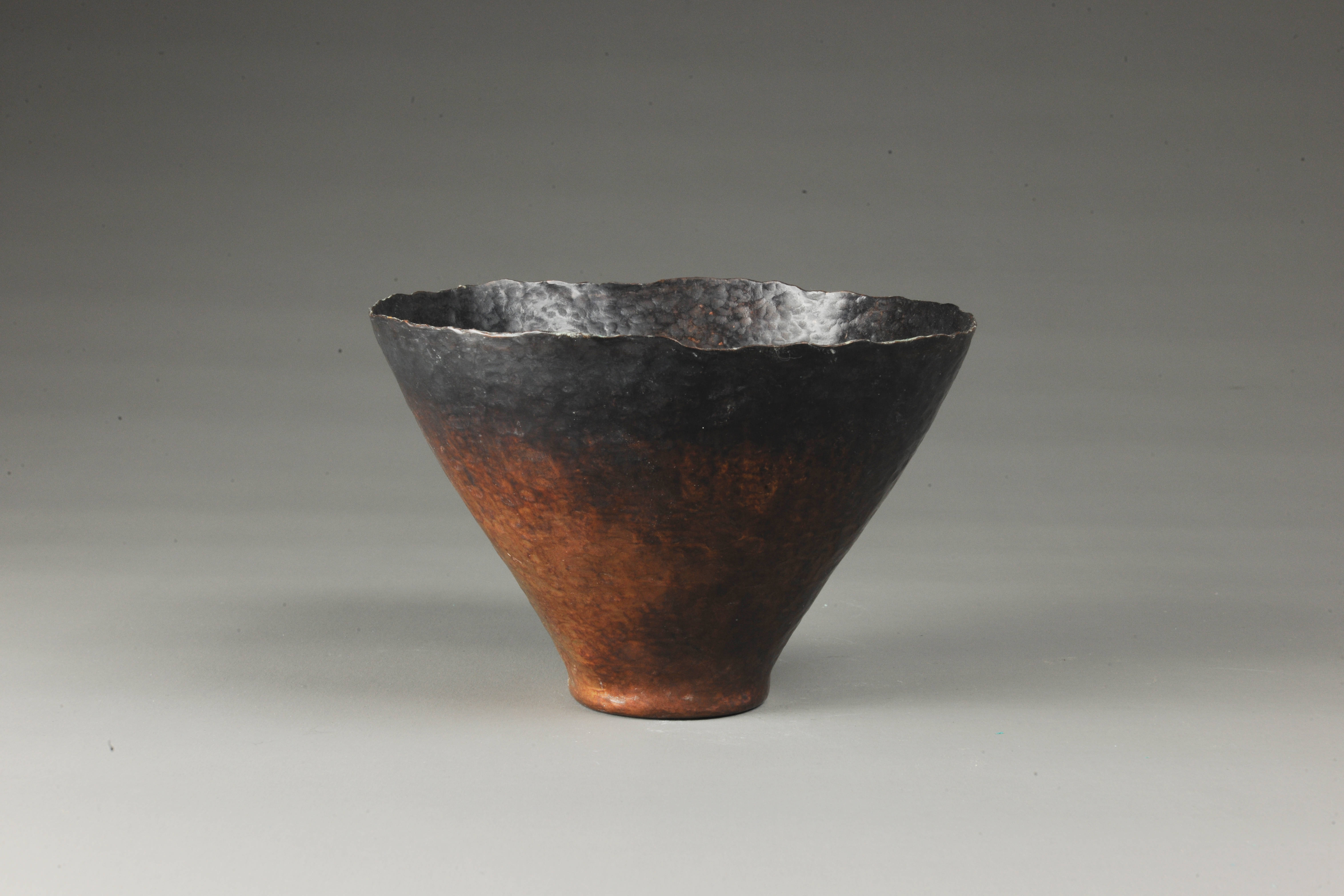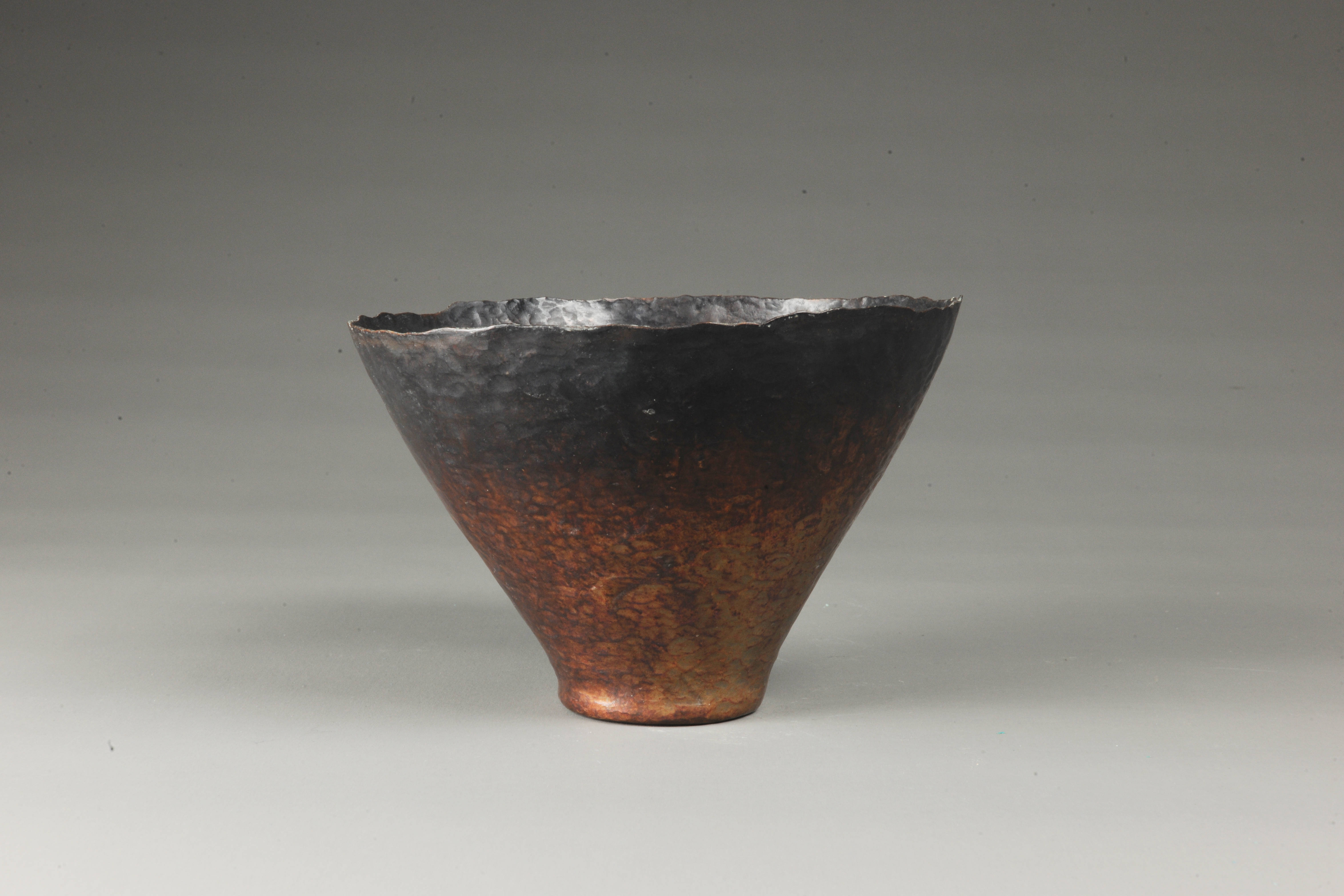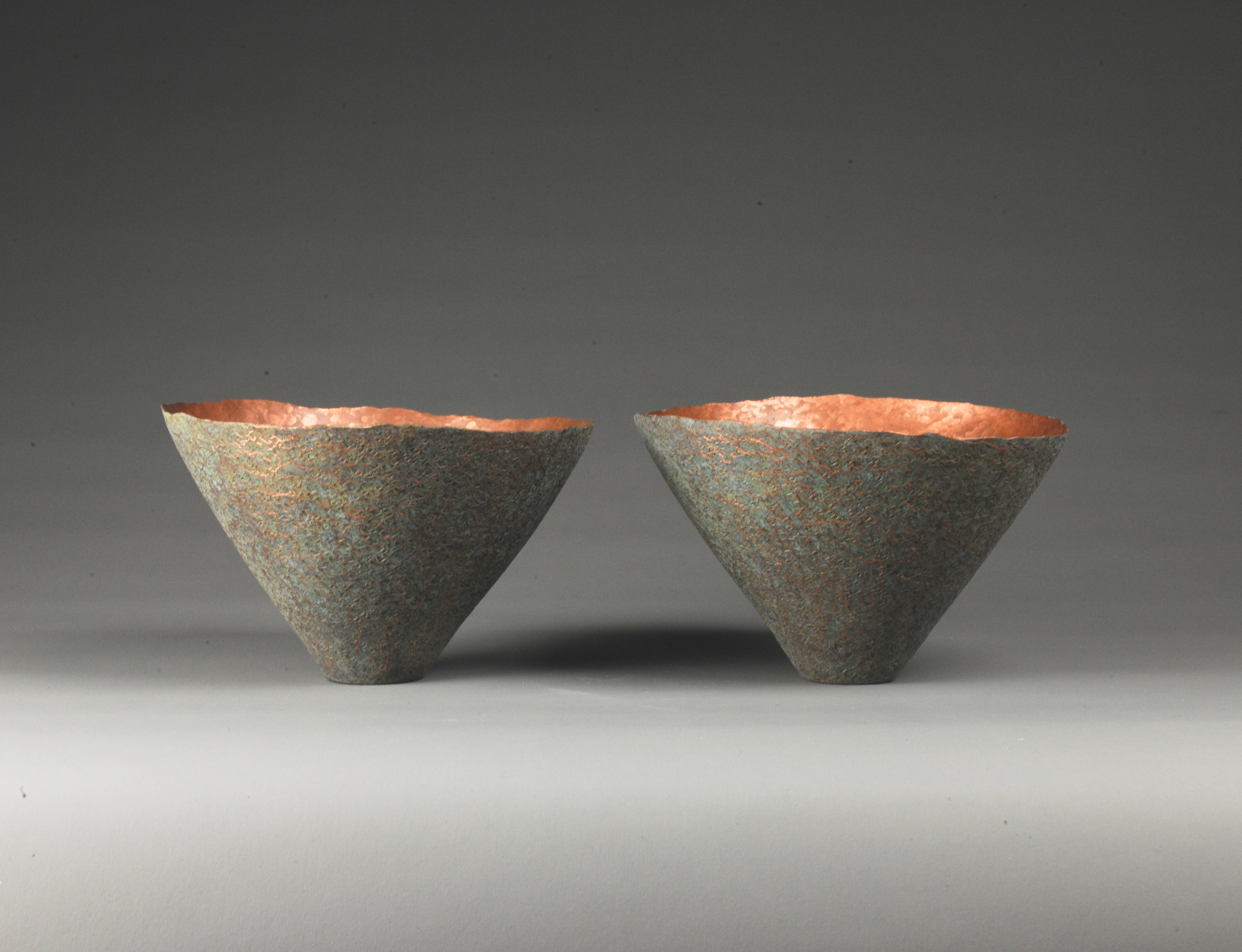 Both of theses vessels are part of a desire to create something different, both have surface treatments to create texture, one is partially chased and then acid etched before patination, the other is experimenting using a ceramic technique -Obvara- to see how it would work on copper at lower temperatures. They both form part of my ongoing body of work.